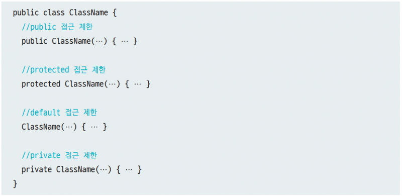 생성자는 다음과 같이 public, protected, default, private 접근 제한을 가집니다.